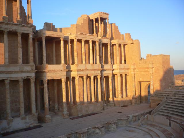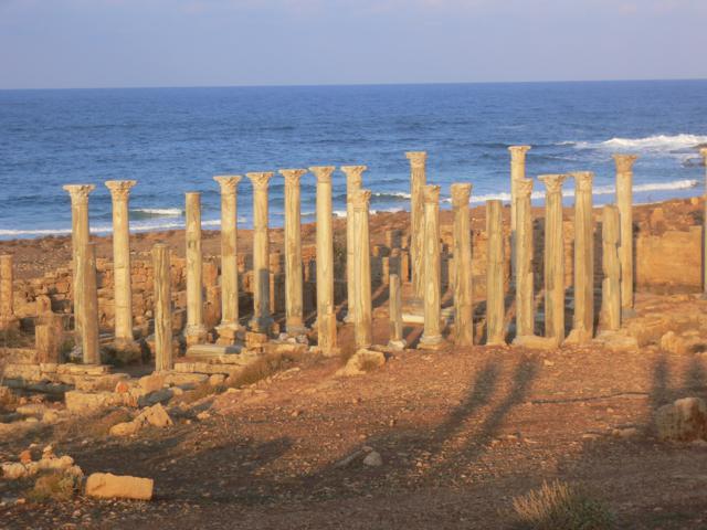 Counterpoint to the featureless highway and the first bleak town of poor provincial Libya, Sabratha had form ~ a Berber, Phoenician, Hellenistic and later Roman  settlement. Sometimes drifting off to sleep at night, I conjure up the still majesty of the theatre at Sabratha as the sun sets on its sandstone. Now a UNESCO World Heritage site, its three colonnaded stories tower behind the stage testimony in scale and beauty to the grandeur of great Roman architecture. The dying sun turns them rose.