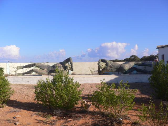 Further along, in a field by the side of the highway is a sight to recall the “vast and trunkless legs of stone” and “shattered visage” of Shelley’s Ozymandias that lies in another desert somewhere else. Here are the bronze outstretched torsos of the Philaeni brothers. The Italian brothers once stood more than 5 metres tall above the arch which marked the provincial border. Other stone reliefs decorated the arch including one of Mussolini being saluted. Given the horror Italian colonisation wrought on the Libyan people, rubble in a remote field seems appropriate.