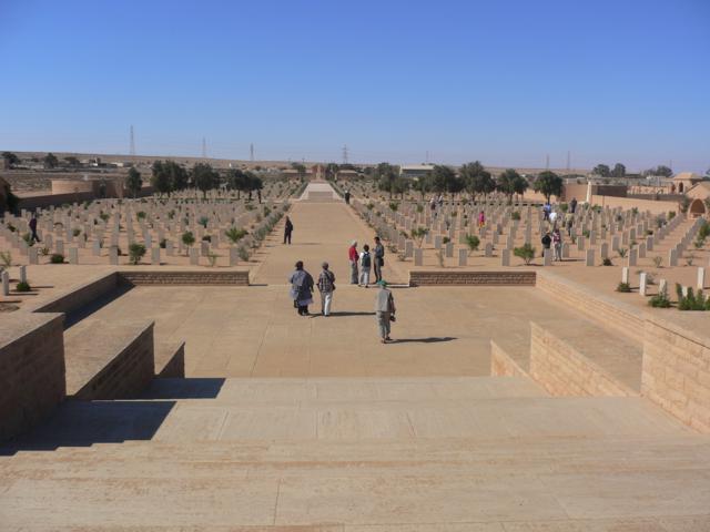 But then we make a dash to Tobruk. We drive through industrial wasteland to the harbour, the deep port so important in WW2 for the landing of reinforcements and supplies. it changed hand between Rommel and the Allies four times during the war. About 7ks inland on the road to Alexandria, stands the Allied war cemetery.  On the 11th of the 11th 2006 at 11am I stood with 22 others for two minutes and remembered the war dead. Many more to remember now. Besides the 11 people I went with, there were some Canadians in that simple rectangular Allied cemetery of white- crossed rows. Young men too young to die whose inscriptions made me cry. “To live in hearts we leave behind is not to die”. “He dies a dinkum hero to keep Australia free”. “We can always remember you smiling, my boy”. Buried here are 3194 Australians, 507 British, 28 Indians and 107 from Poland. There is a simple room at the entrance with an index. I signed the Visitors’ Book there. Next to this simple open memorial, the monumental German memorial stands. Two stories high and made of imposing stone its top battlement afforded a view of the sand coloured town and arid landscape Around the harbour petrochemical plants and oil refineries were silhouetted. Rommel’s bunker is a dilapidated, rubbish strewn, neglected outbuilding surrounded by rubble.