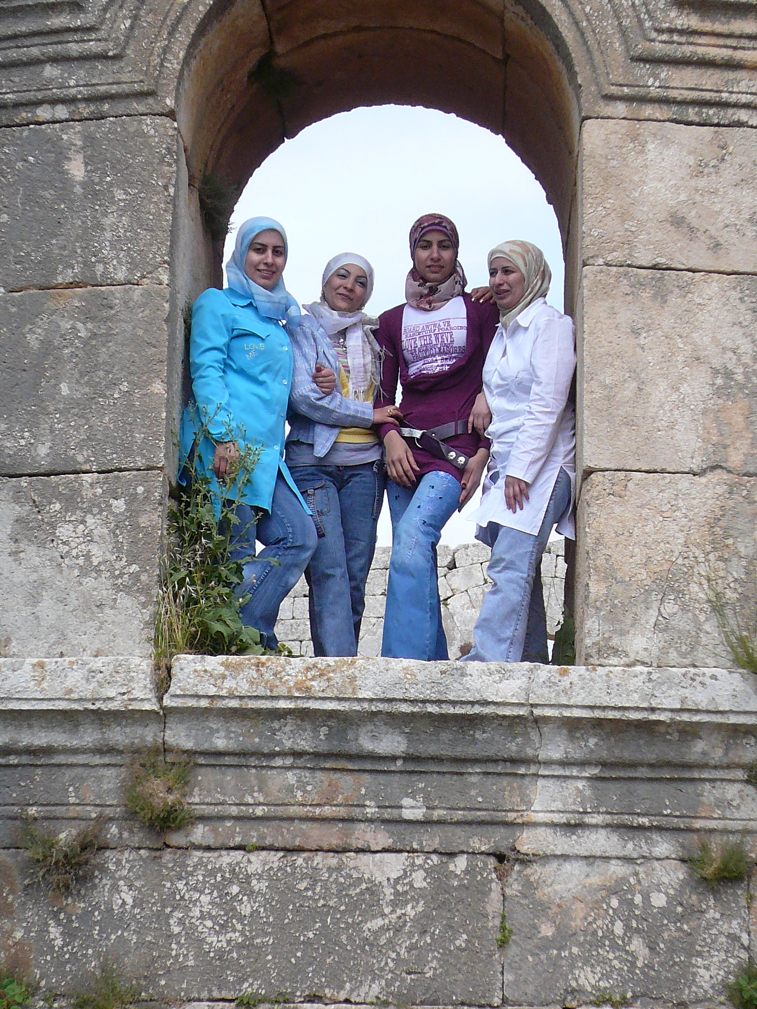 Young girls pose in the window at the Basilica St Simeon where the saint was said to have lived for 37 years on a platform atop of a pillar 15 metres high