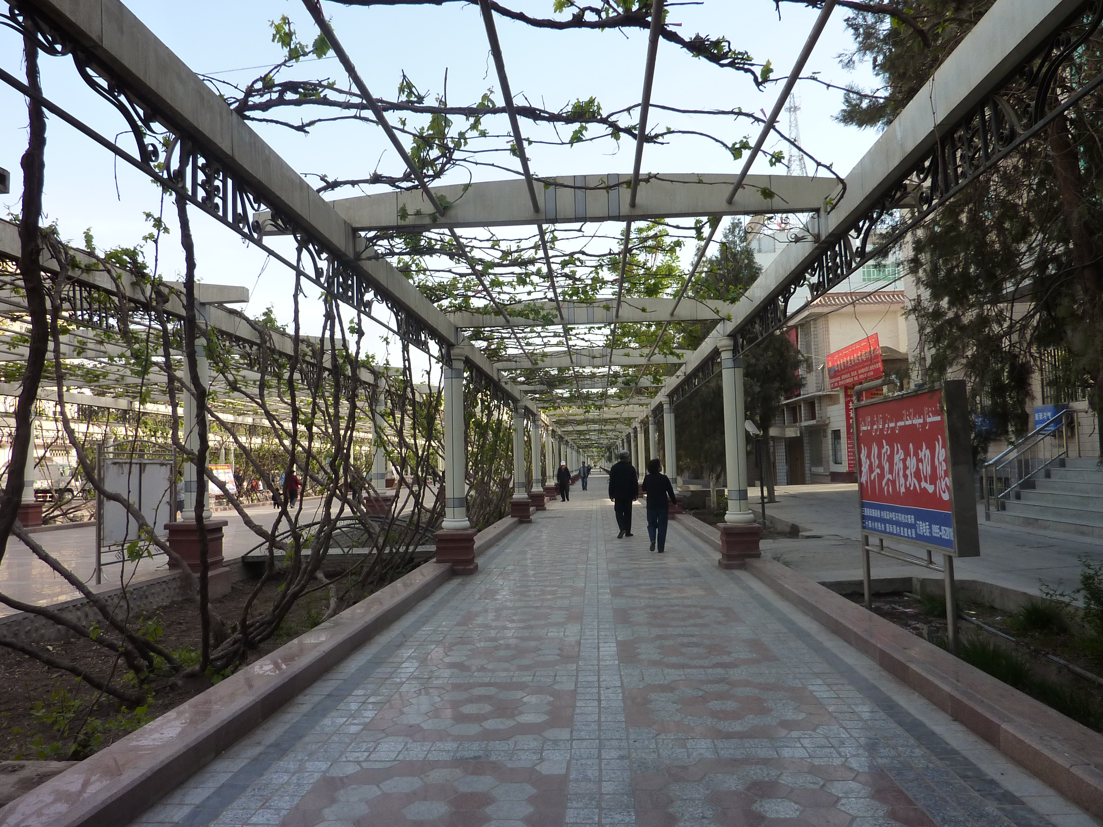 Next Turpan; in 803 the Uyghurs seized this town from the Tibetans. It is the second lowest city in the world after the Dead Sea and remembered by me mostly for the sight of (Uyghur) people under archways of vines in central malls walking backward, as is the custom, for the exercise. The people here are among the longest lived in the world. When asked, the longevity is put down to the fact that babies’ heads are shaved and sunned for the first few years of life and to local milk, drunk daily.