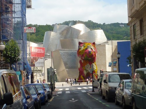 It took my breathe away. Soaring rounded titanium sheets catching the light as they flowed into each other and in front, a riot of coloured flowers, sits Jeff Koenig’s puppy.