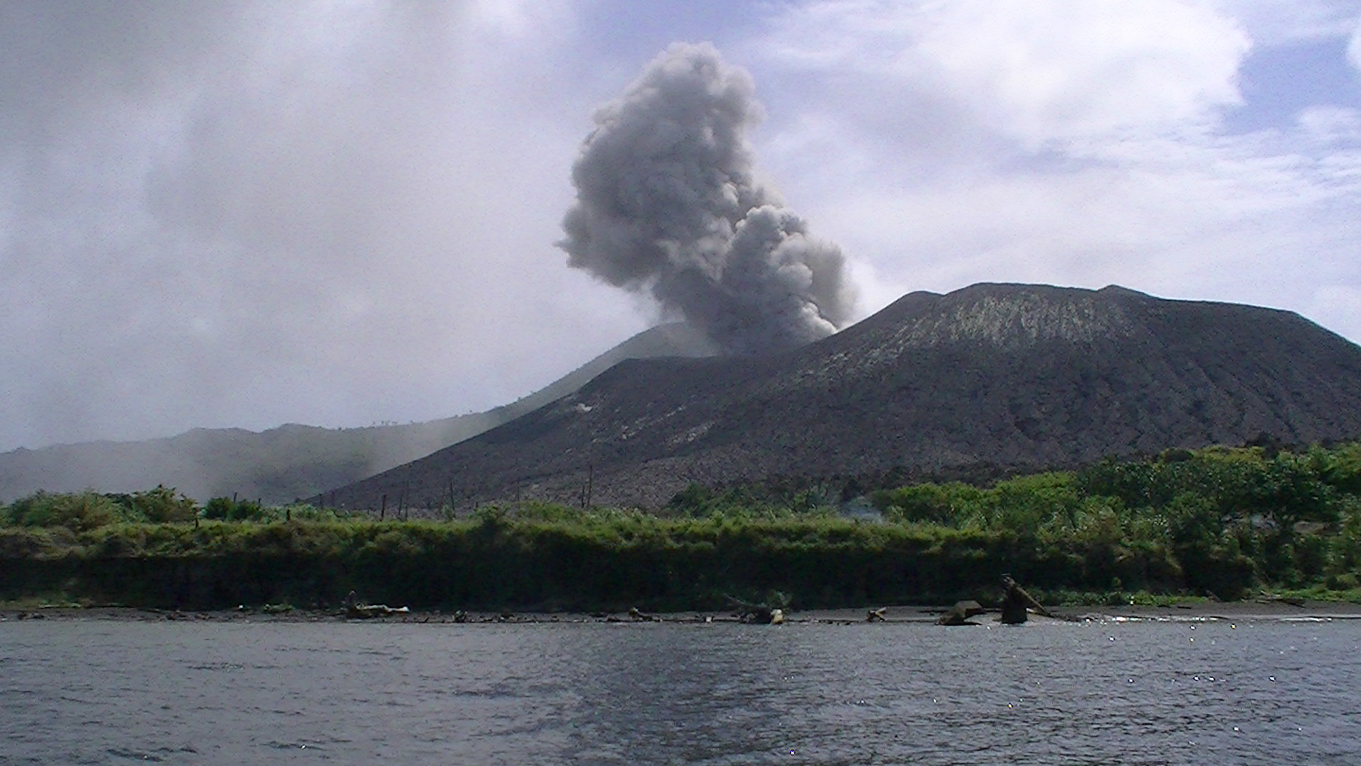 Tavurvur spurts ominously; ash hangs in the air