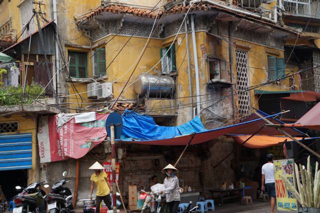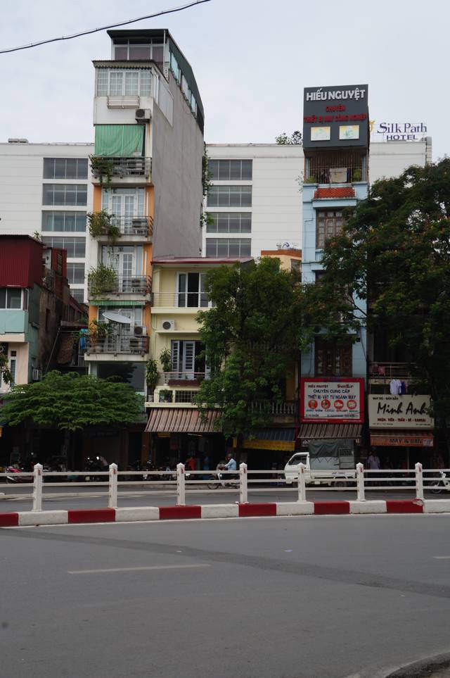 There’s the Old Quarter and then there’s the rest of the centre – a miss mash of sometimes refurbed and sometimes decaying French villas laid out in wide treed lined boulevards infilled with “the best that could be done at the time” in-fill. Some houses were so high and narrow there could be only one room on each floor; some were chaotic rearrangements of tumbling villas. Many of the commercial premises have been tacked onto what were once the small gardens of old houses and so they opened straight onto the motor scooter inundated footpath. The idea of a “building line” so dear to western town planners is a fantasy in Hanoi. But it all hangs together with cheerful ramshackle character.